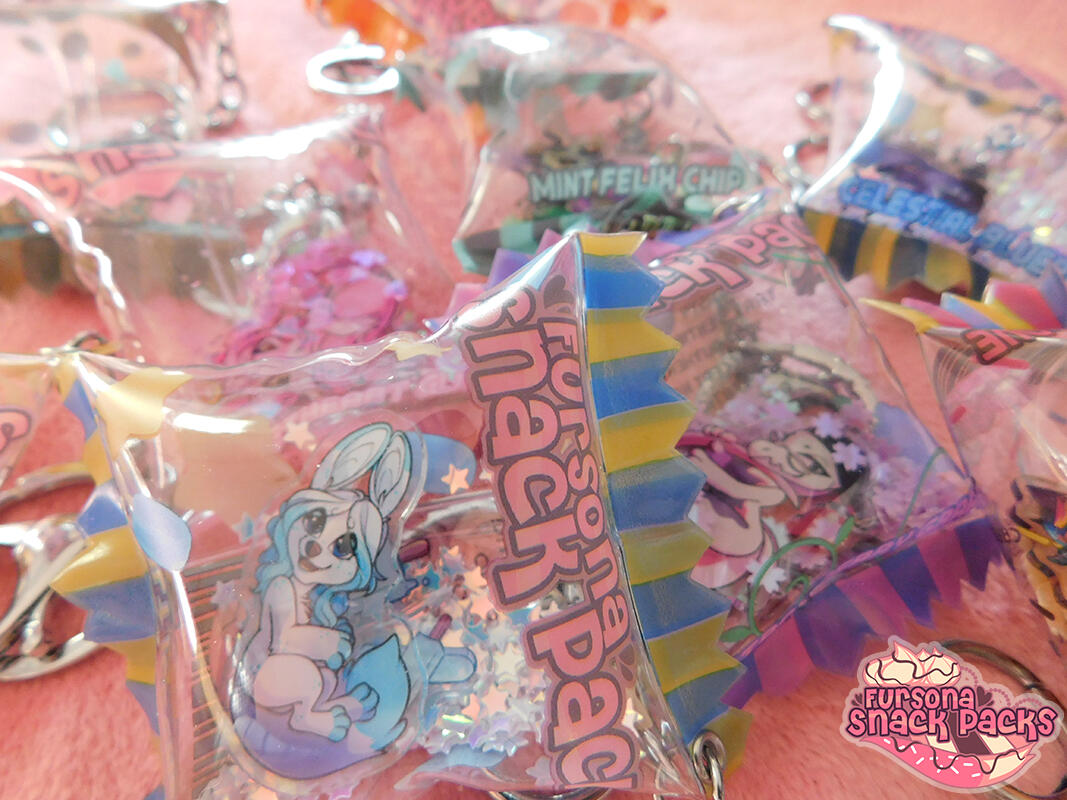 What IS a "Fursona Snack Pack"? - Fursona snack packs are adorable personalized shaker style keychains, made to resemble little packaged snack foods. Inside of each snack pack is an acrylic charm of your fursona, and two correlating food items with your snack pack's theme.